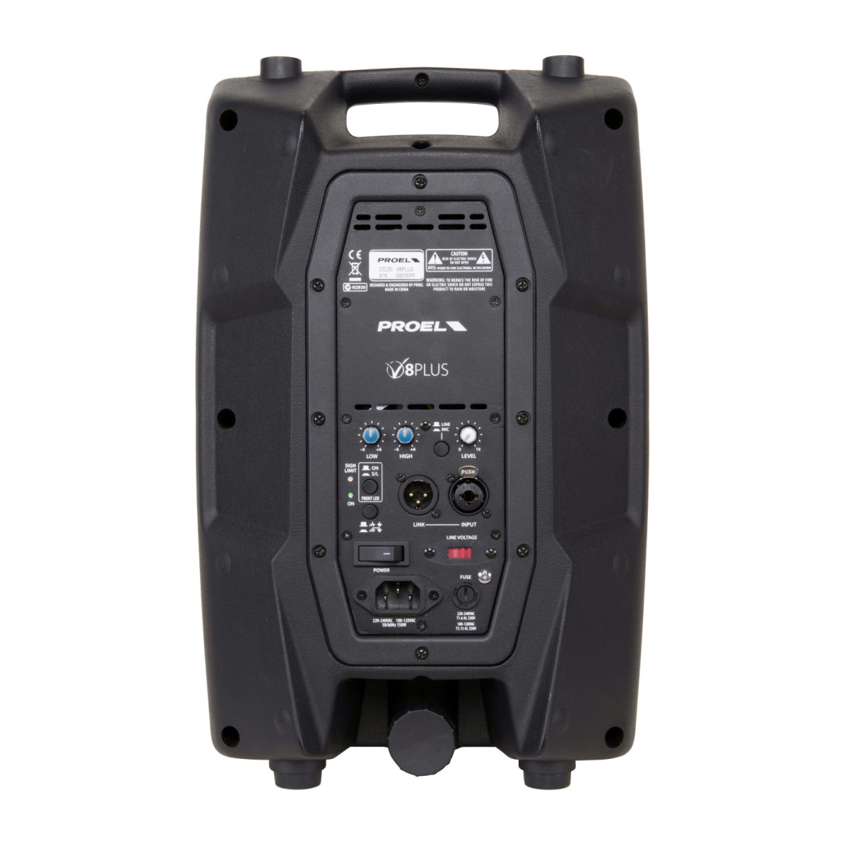 Mẫu V8PLUS được trang bị module khuếch đại hiệu suất cao có khả năng cung cấp công suất mạnh mẽ 400 W cho các bộ chuyển đổi âm thanh. Nhờ công nghệ SMPS, công suất này được tích hợp trong một thiết kế siêu nhẹ, làm cho dòng V PLUS trở thành những chiếc loa PROEL di động nhất từ trước đến nay. Module khuếch đại được đặt trong hộp nhôm kín hoàn toàn, mang lại sự bảo vệ, cách ly hoàn hảo khỏi môi trường bên ngoài và khả năng làm mát cực kỳ hiệu quả.